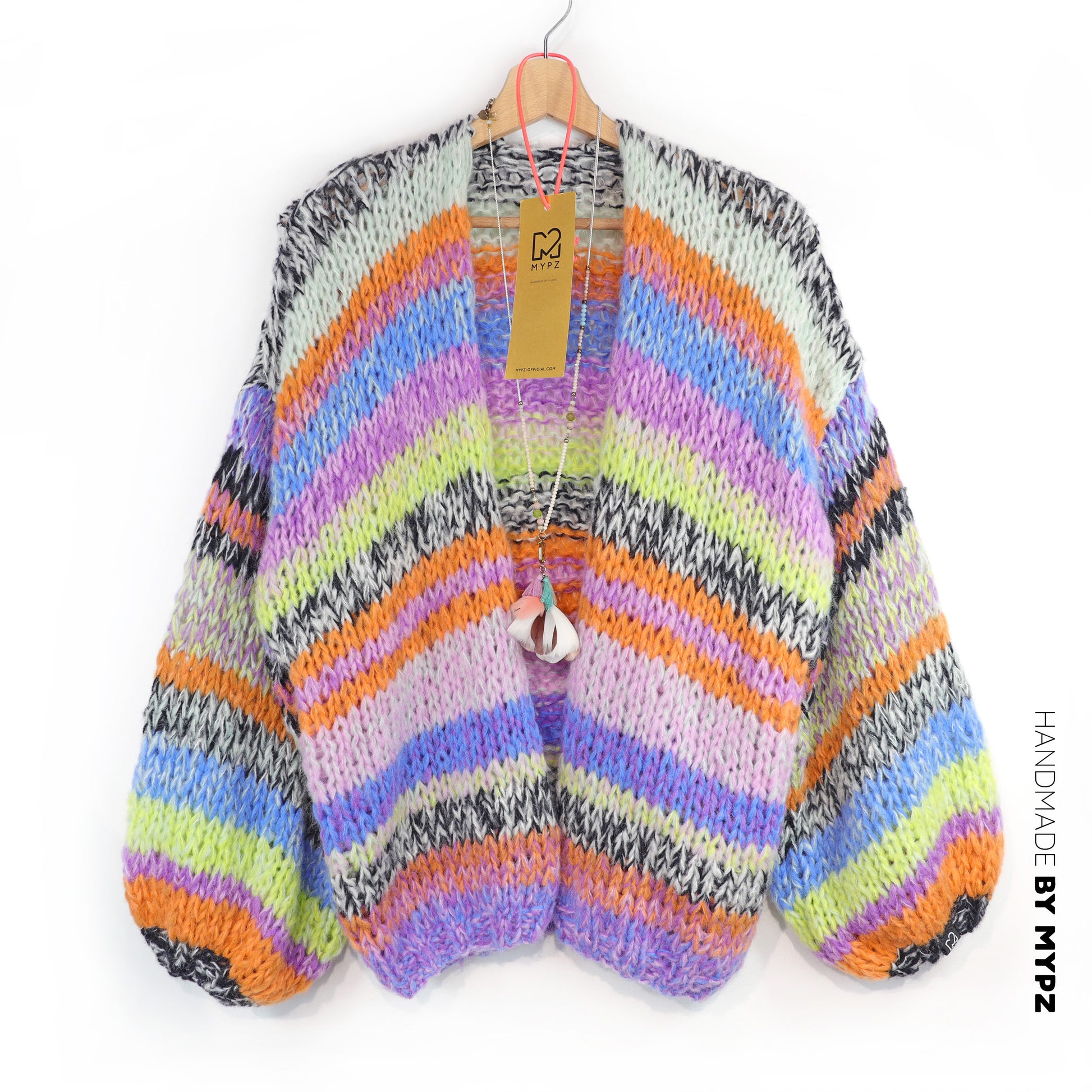 This is a handmade knit made by MYPZ in The Netherlands. Each cardigan or sweater is a unique piece and we take a lot of time and care to create these beautiful products. This beautiful sweater is made of a high quality Alpaca-Wool and does not shed. It is very light, warm and comfortable.