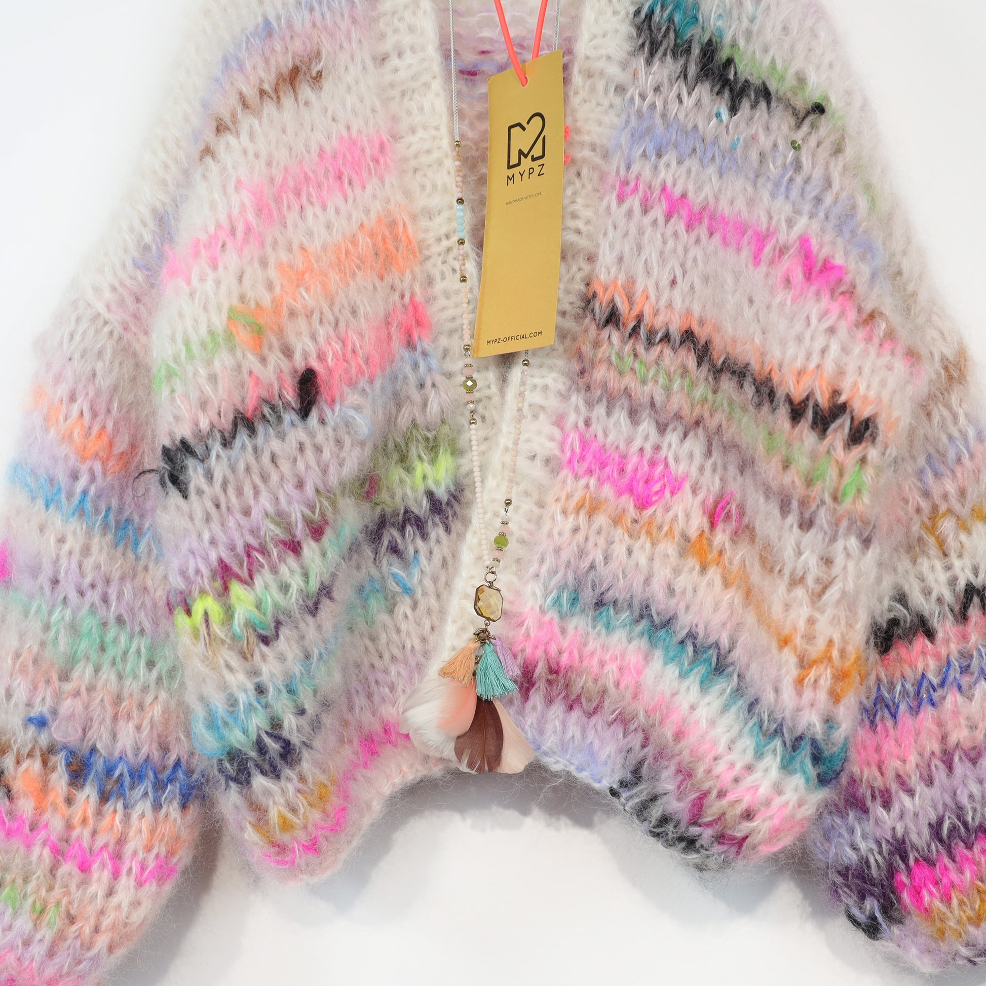 Je breit met 2 draden van MYPZ Chunky Kidmohair dk: 1 draad Off White + 1 draad restgaren (verschillende kleuren en lengtes aan elkaar geknoopt)