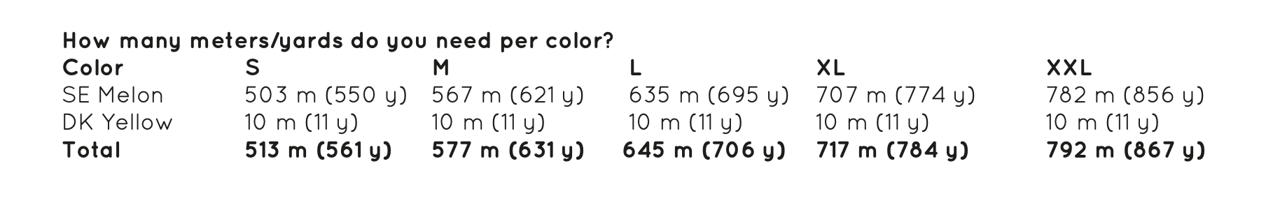Hoeveel garen heb je nodig, gebaseerd op de kleuren op de foto voor maat S & M (L & XL, XXL):