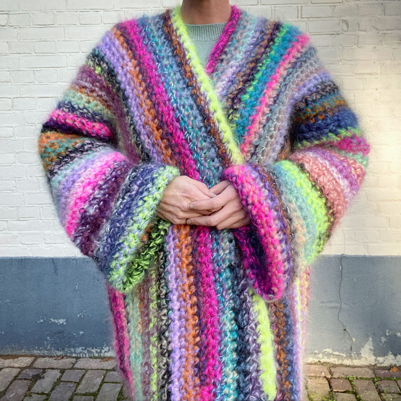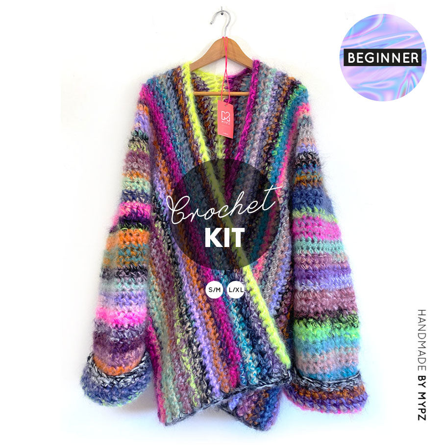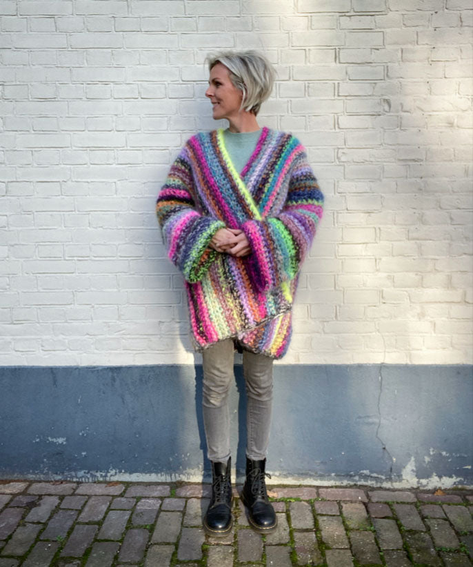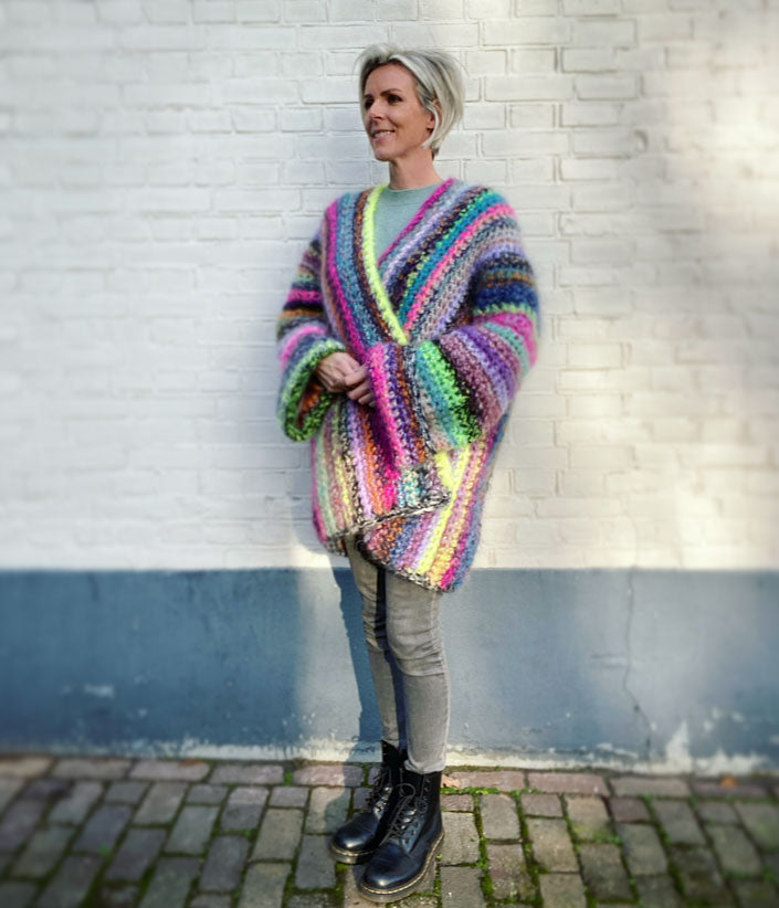 Je haakt deze kimono met 2 draden samen van MYPZ Chunky Kidmohair DK.