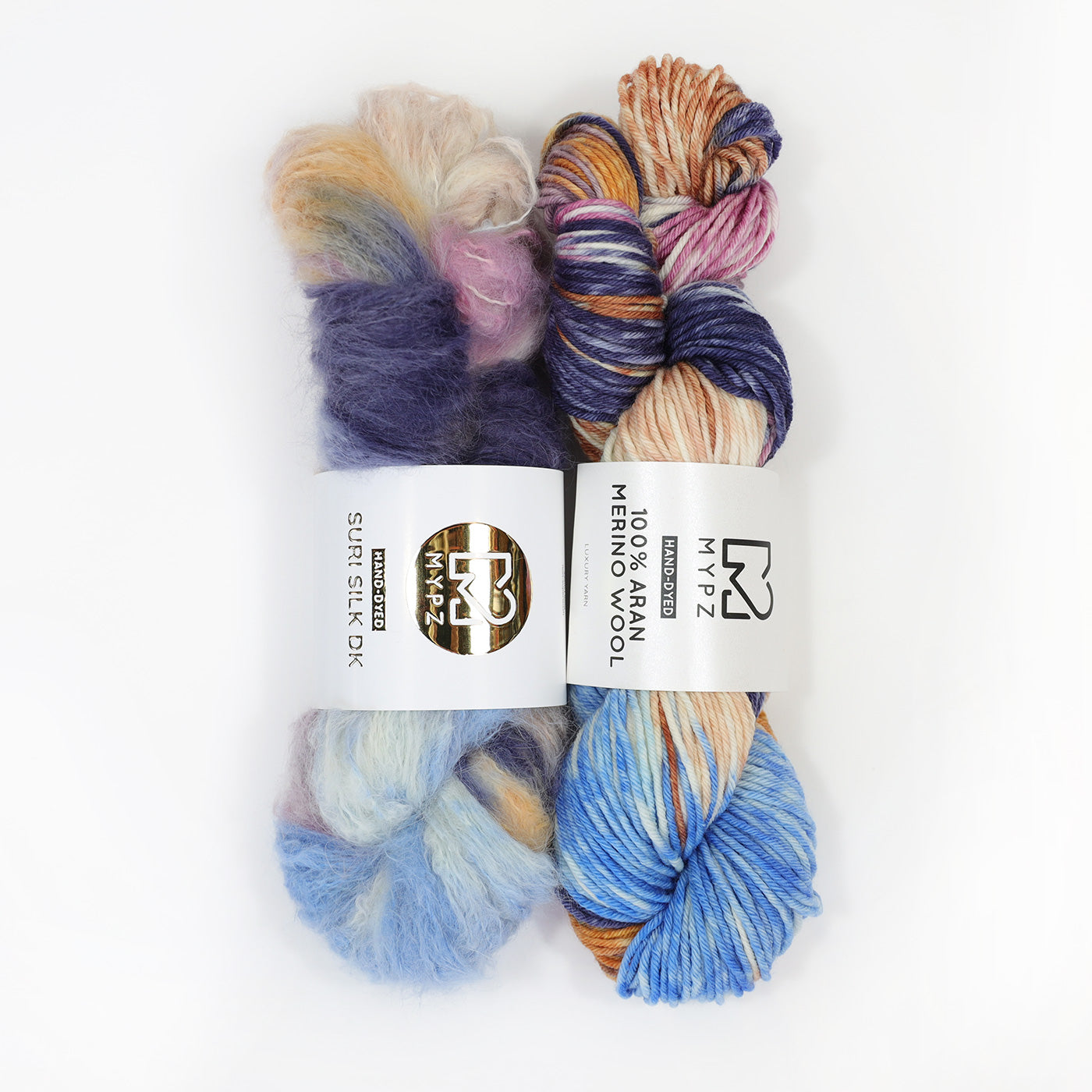 1 skein MYPZ Suri Silk DK & 1 skein MYPZ 100% Aran Merino Wool.