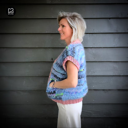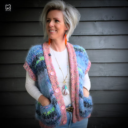 Garen en kleuren: Je breit met 2 draden MYPZ Chunky kidmohair DK samen. Soms gebruiken we ook andere garens samen voor een speciaal effect. Uiteindelijk brei je met 2 Dk-gewicht garens samen.