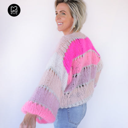 Het model wordt met 1 draad MYPZ chunky kidmohair dk gebreid. De streepjes tussendoor zijn met 2 draden MYPZ Sparkle Merino samen.