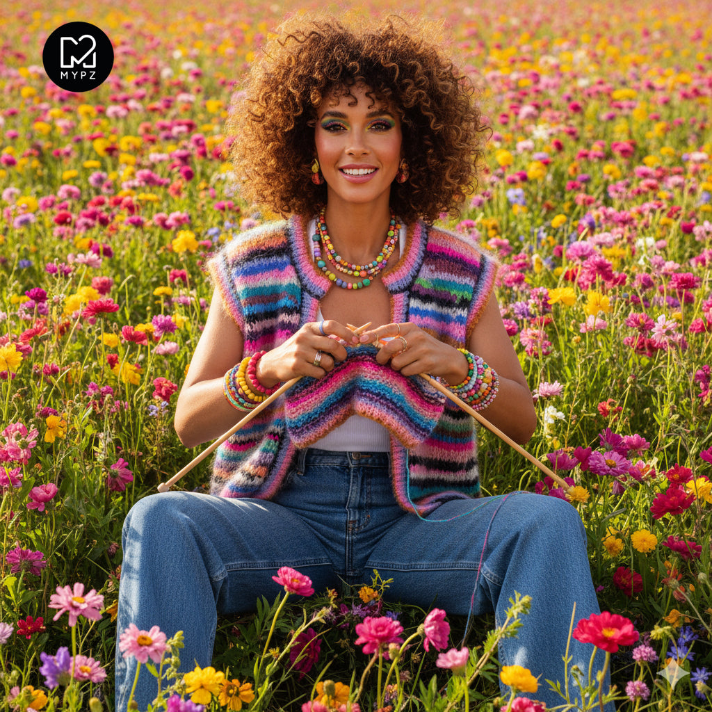 Het gilet op de foto is gebreid met verschillende kleuren van MYPZ Chunky kidmohair DK in verschillende lengtes. Je kunt onze Left Over Bundle gebruiken om een vest als deze breien.