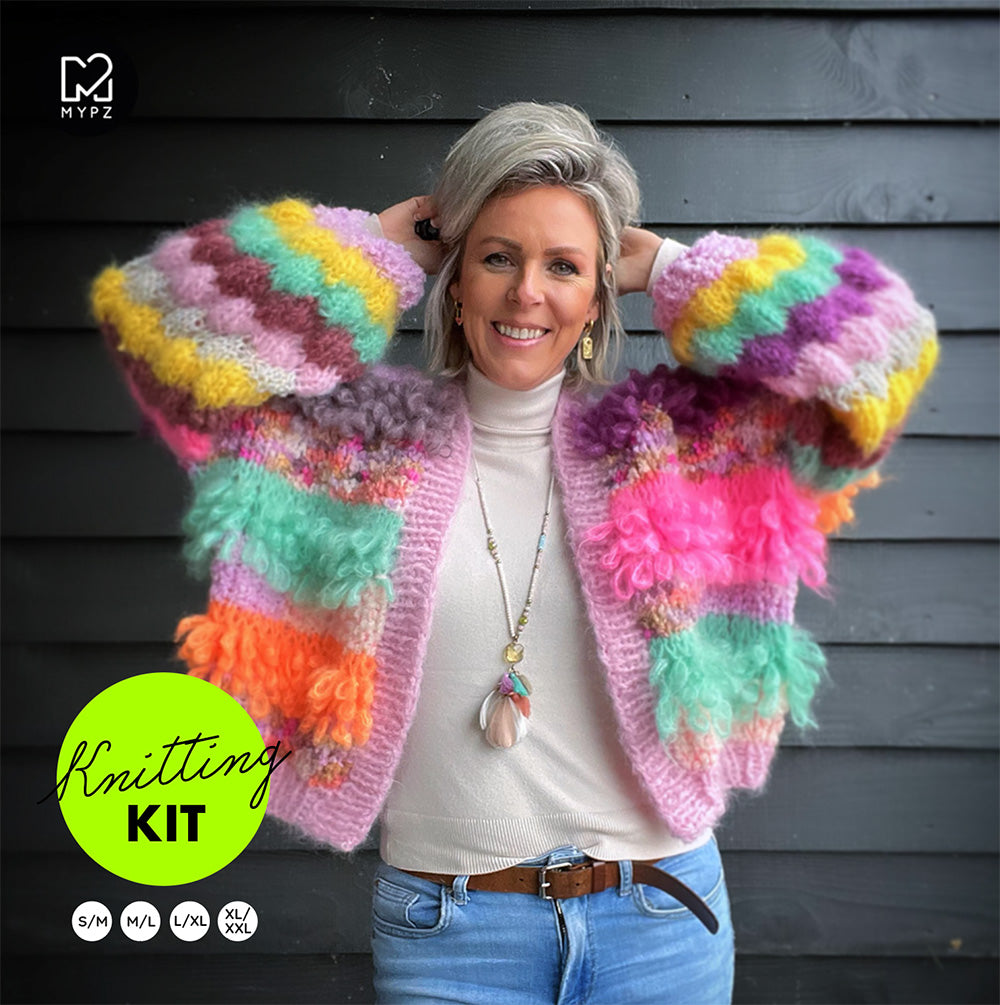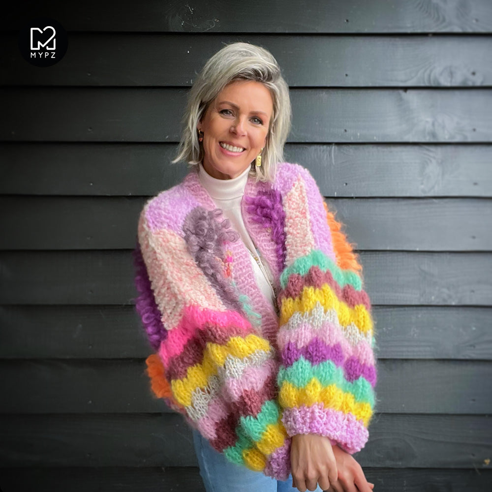 Dit mooie chunky gekke mohair vest is erg licht, warm en comfortabel. Deze kit bevat MYPZ Teddy, een hoogwaardig chunky/bulky garen, superzacht en fluffy! én MYPZ Chunky kidmohair!