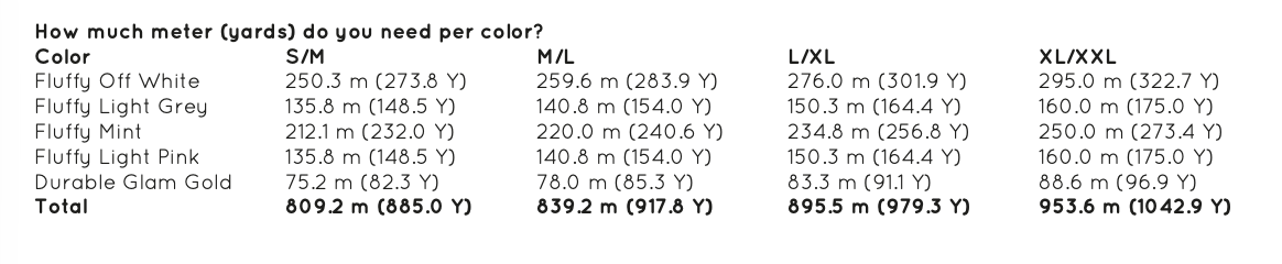 Hoeveel garen heb je nodig, gebaseerd op de kleuren op de foto voor maat S/M, M/L (L/XL & XL/XXL):