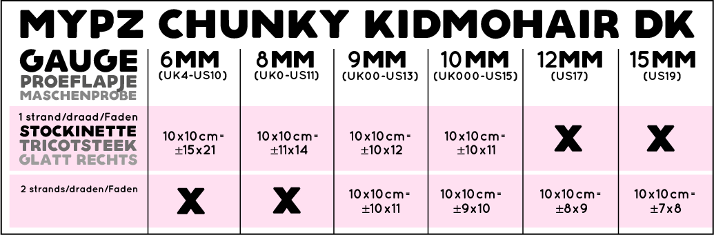 Voor onze Basic Chunky mohair pullover heb je nodig: ± 8 bollen MYPZ Chunky Kidmohair DK (+1 M/L) (+2 XL/XXL)